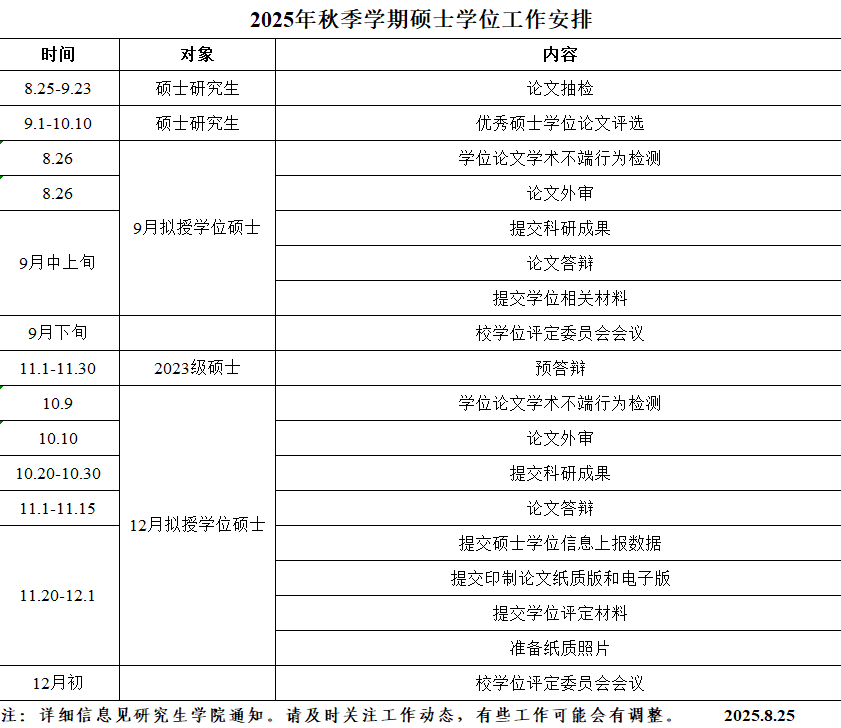 2025年秋季学期硕士学位工作安排