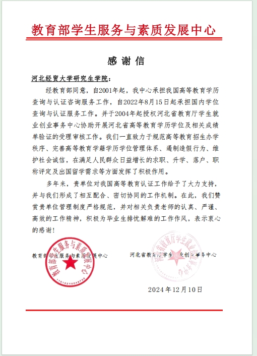 近日,bat365官网收到来自教育部学生服务与素质发展中心的感谢信,信中对bat365官网在河北省高等教育学历学位及相关成绩单验证的受理审核工作中给予的支持表示感谢。